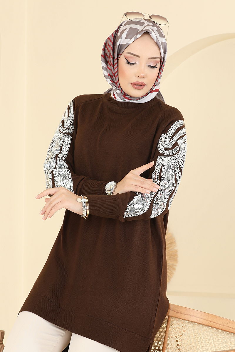 Kolları İşlemeli Triko Tunik 2494UZ662 Kahve