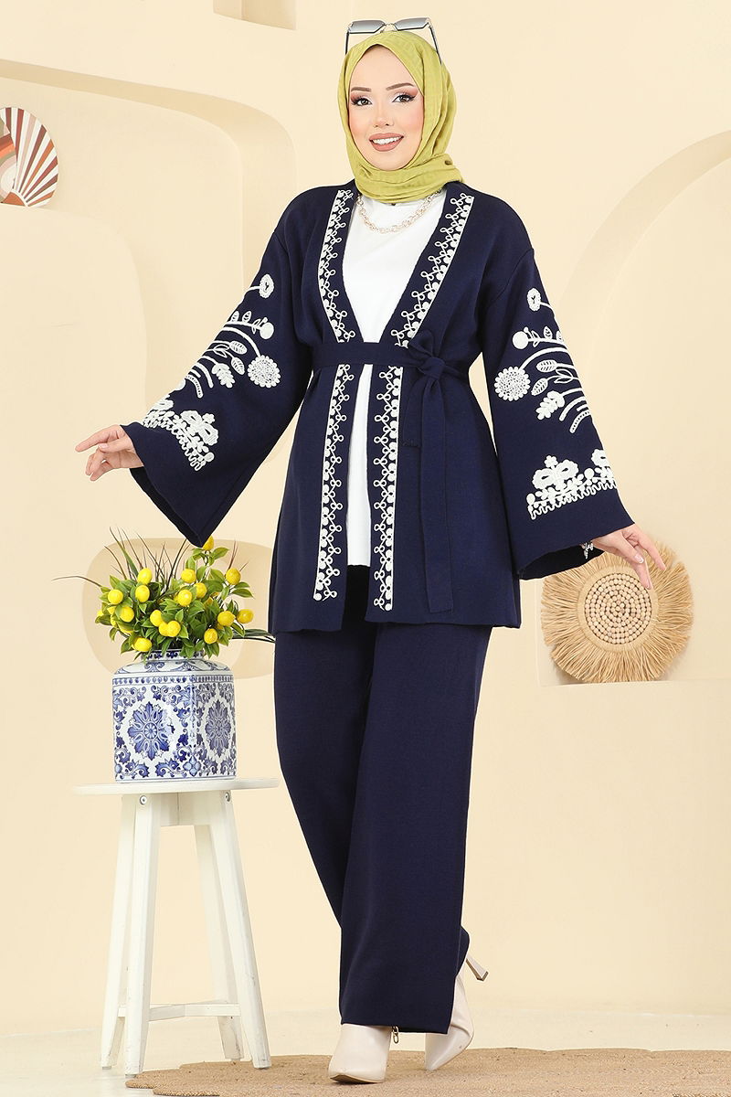 Kolları Nakış İşlemeli Takım model tesettür ürünüdür. Sonbahar ve Kış sezonunda kullanılabilir. 30 derecede sıkma yapılmadan yıkanmalıdır. Birinci sınıf Triko kumaştan imal edilmiştir. Ürün Ceket yakadır. Astarsızdır. (Modelin üzerindeki ürün standart bedendir.) Nakış detayları dikilidir. Pantolon beli lastiklidir.