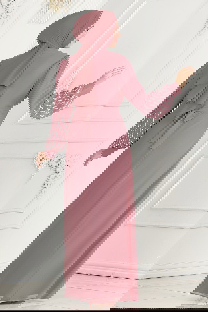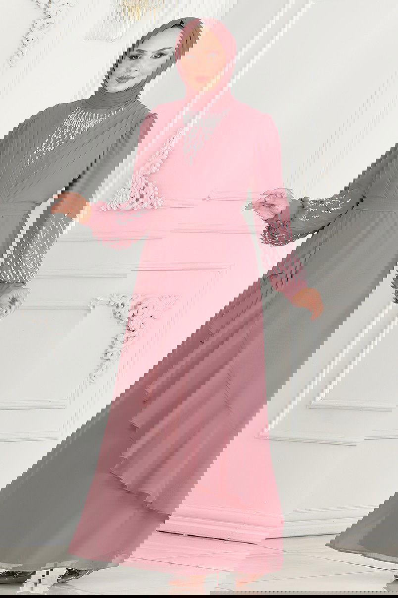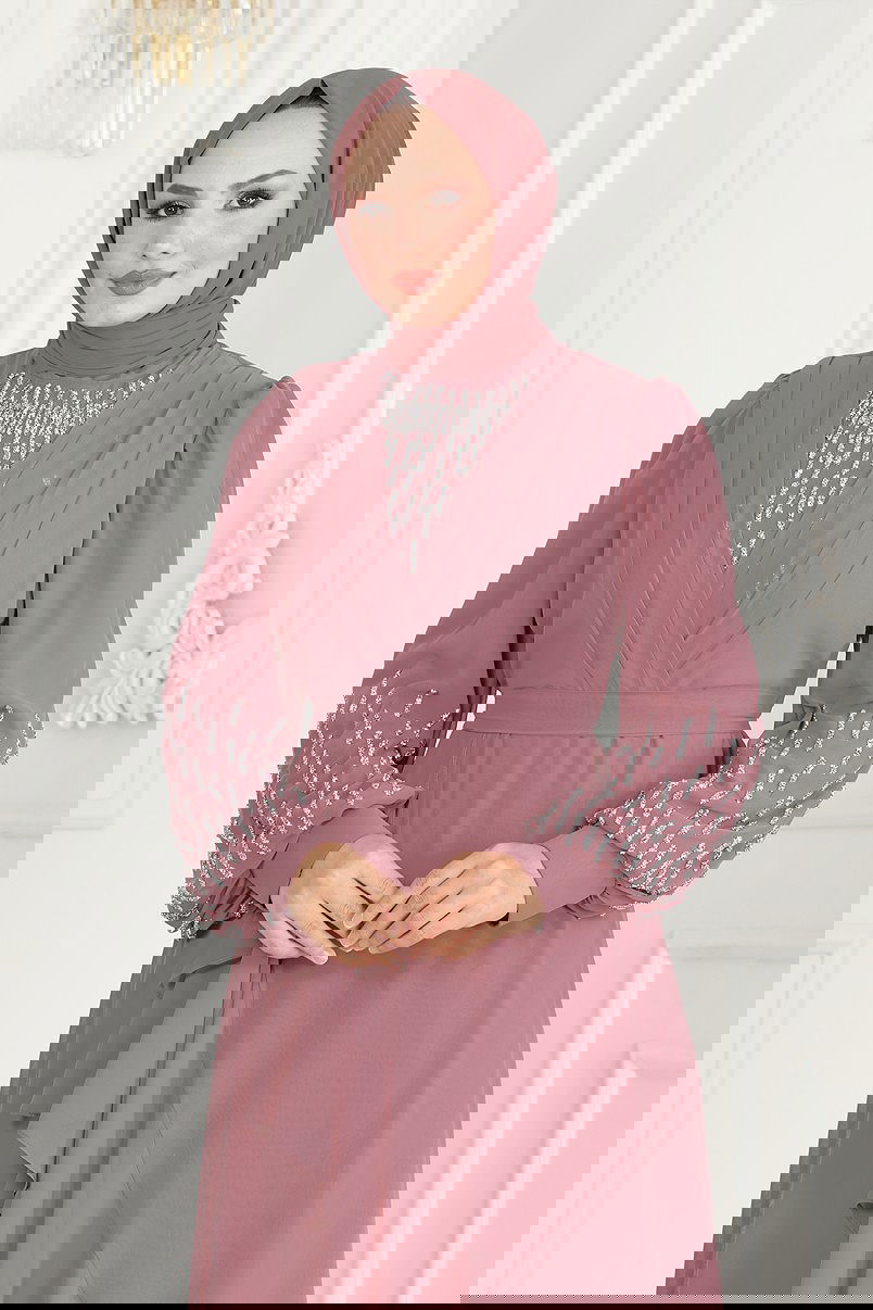 Kolları Taşlı Şifon Abiye 6585YG95 Gül Kurusu