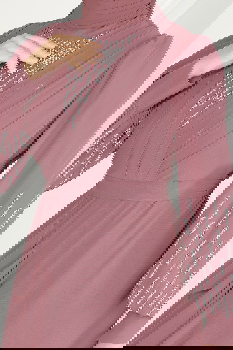 Kolları Taşlı Şifon Abiye Gül Kurusu