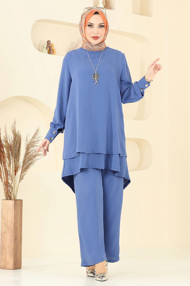 Ürün Özelliği : Yeni sezon tesettür moda ürünüdür. Ürün kafadan giyilmektedir. Ürün Bisiklet yakadır. Astarsızdır. Kolye ürüne dahildir, isteğe bağlı kullanılmayabilir. Pantolon beli lastiklidir. Manşet düğmeleri aktiftir.Konsept fotoğraf çekimlerinden dolayı üründe ton farklılığı olabilir.