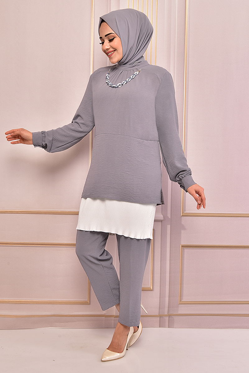 Kolyeli Tesettür Takım EFS4070-M Gri