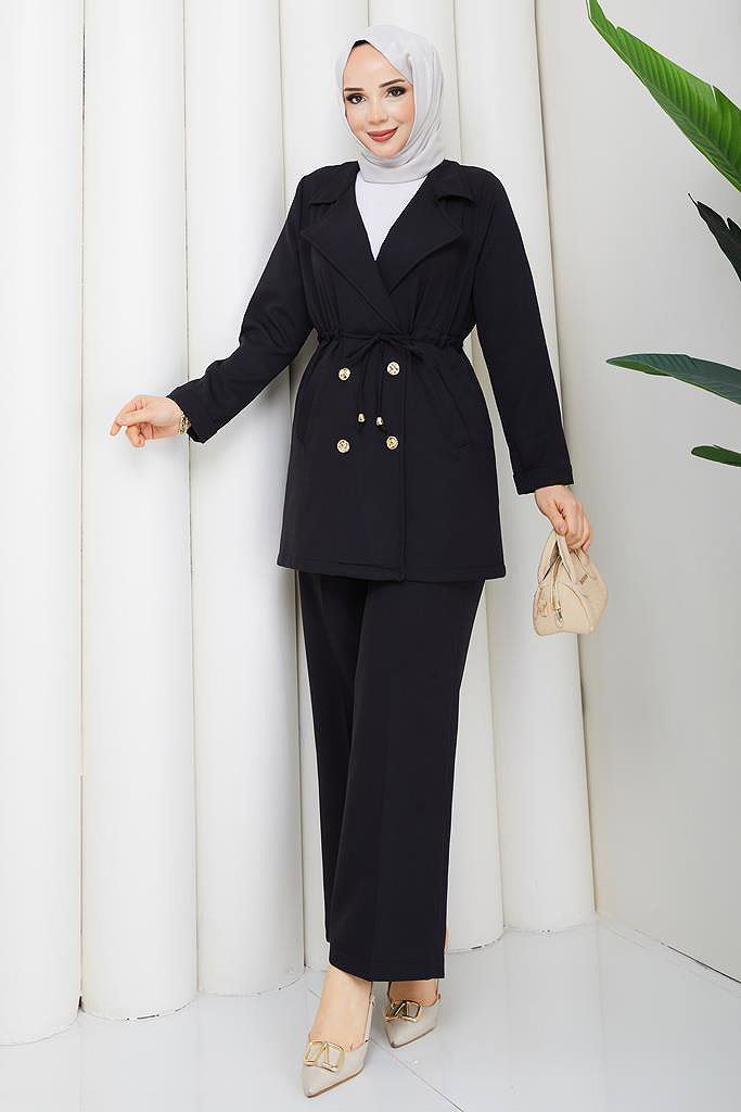 Şık ve pratik Kruvaze Yaka 2'li Takım Kombin ile tarzınızı konuşturun! Dört mevsim rahatlıkla kullanabileceğiniz bu tesettür ürün, hassas yıkama ile 30 derecede yıkanabilir özelliğe sahiptir. Dayanıklı dabıl kumaştan üretilen ürün, kruvaze yaka tasarımı ve önünden düğmeli yapısı ile dikkat çeker. Astarsız oluşu rahat bir kullanım sunarken, beli bağcıklı tasarım ve lastikli pantolon beli konforu artırır. Hem ceket hem de pantolonda bulunan cepler ise fonksiyonellik katıyor. Bu zarif set, hem özel günlerinizde hem de günlük kullanımda ideal!