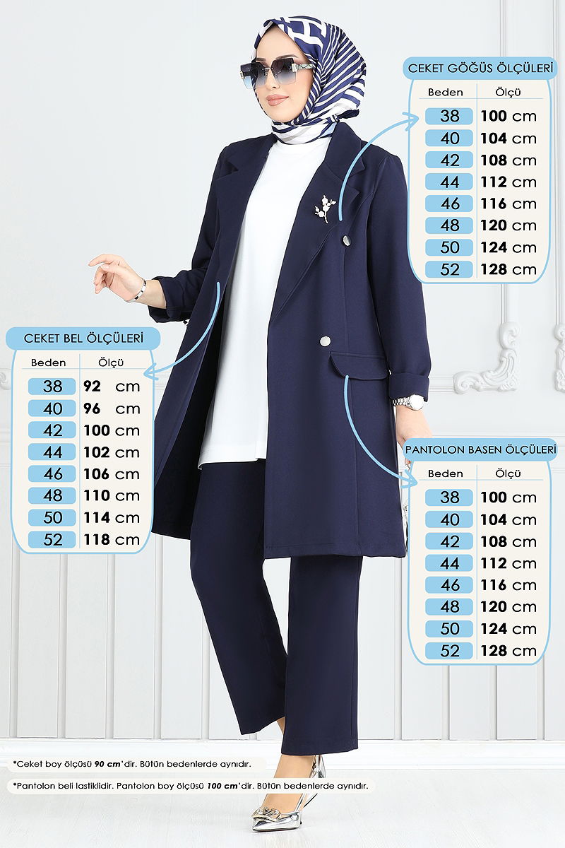 Kruvaze Yakalı Ceket Takım , tesettür tarzına uygun şık bir seçenektir. Dört mevsim rahatlıkla kullanılabilir yapısı ile dikkat çeken bu takım, 30 derecede hassas yıkama imkanı sunar. Dabıl kumaş kullanılarak üretilmiş olan bu ürün, kruvaze yaka tasarımı ve önü düğmeli yapısıyla pratik bir kullanım sağlar. Astarsız olan ceket, rahatlığı artırırken, elastik bel pantolon konforu bir adım öteye taşır. Ceket ve pantolon üzerindeki cep detayları ise şıklığı tamamlar.