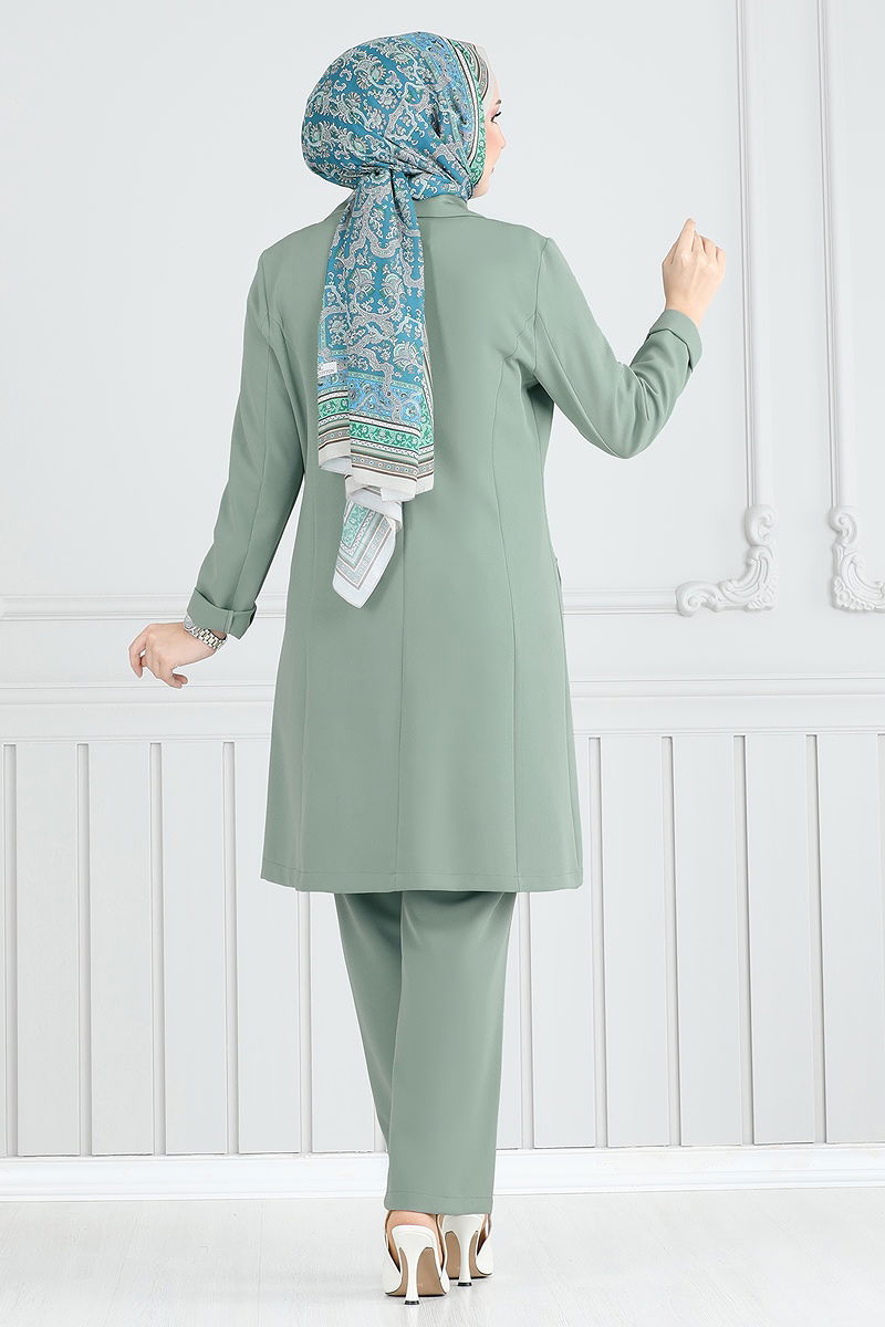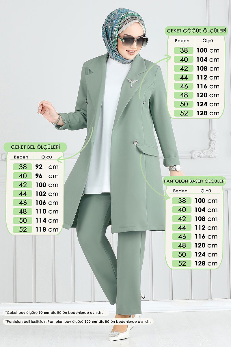Kruvaze Yakalı Ceket Takım , tesettür tarzına uygun şık bir seçenektir. Dört mevsim rahatlıkla kullanılabilir yapısı ile dikkat çeken bu takım, 30 derecede hassas yıkama imkanı sunar. Dabıl kumaş kullanılarak üretilmiş olan bu ürün, kruvaze yaka tasarımı ve önü düğmeli yapısıyla pratik bir kullanım sağlar. Astarsız olan ceket, rahatlığı artırırken, elastik bel pantolon konforu bir adım öteye taşır. Ceket ve pantolon üzerindeki cep detayları ise şıklığı tamamlar.
