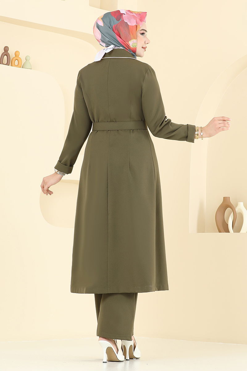 Ürün Özelliği : Yeni sezon tesettür moda ürünüdür. Önden kullanılabilir bir düğmesi bulunmaktadır. Ürün Kruvaze yakadır. Astarsızdır. Düğmeler aksesuardır. Kemer ürüne dahildir, isteğe bağlı kullanılmayabilir. Pantolon beli lastiklidir. Konsept fotoğraf çekimlerinden dolayı üründe ton farklılığı olabilir.