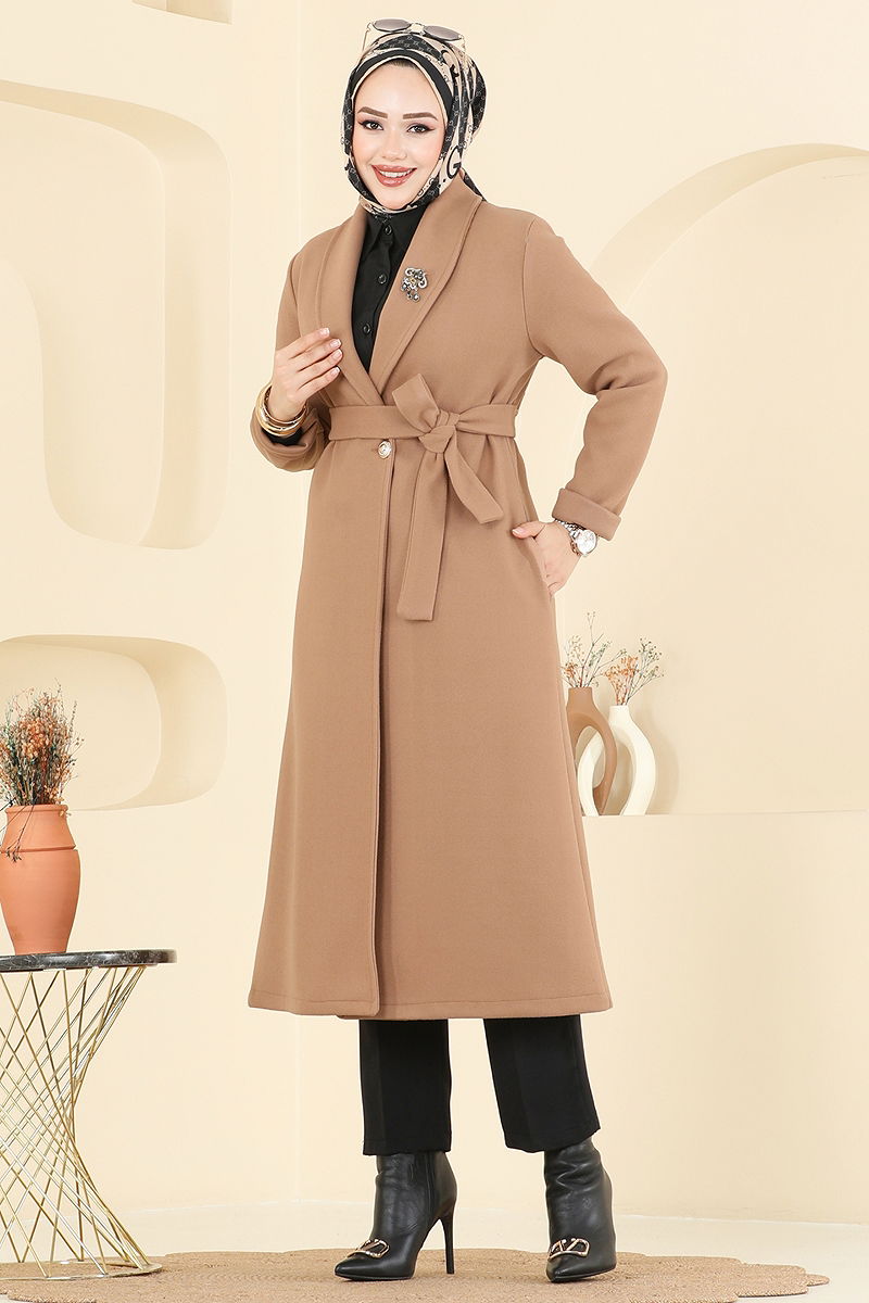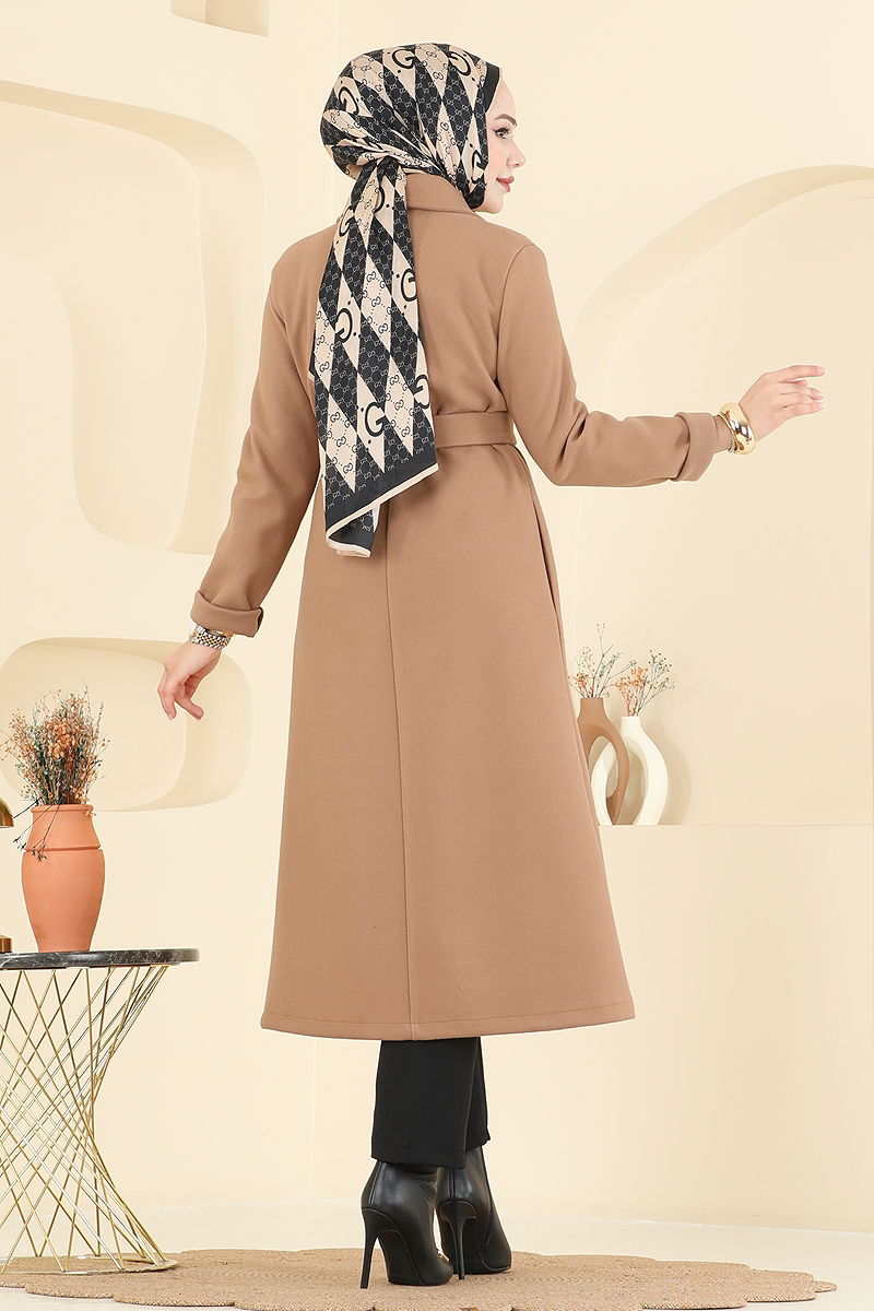 Kruvaze Yaka Kaşe Kaban Camel