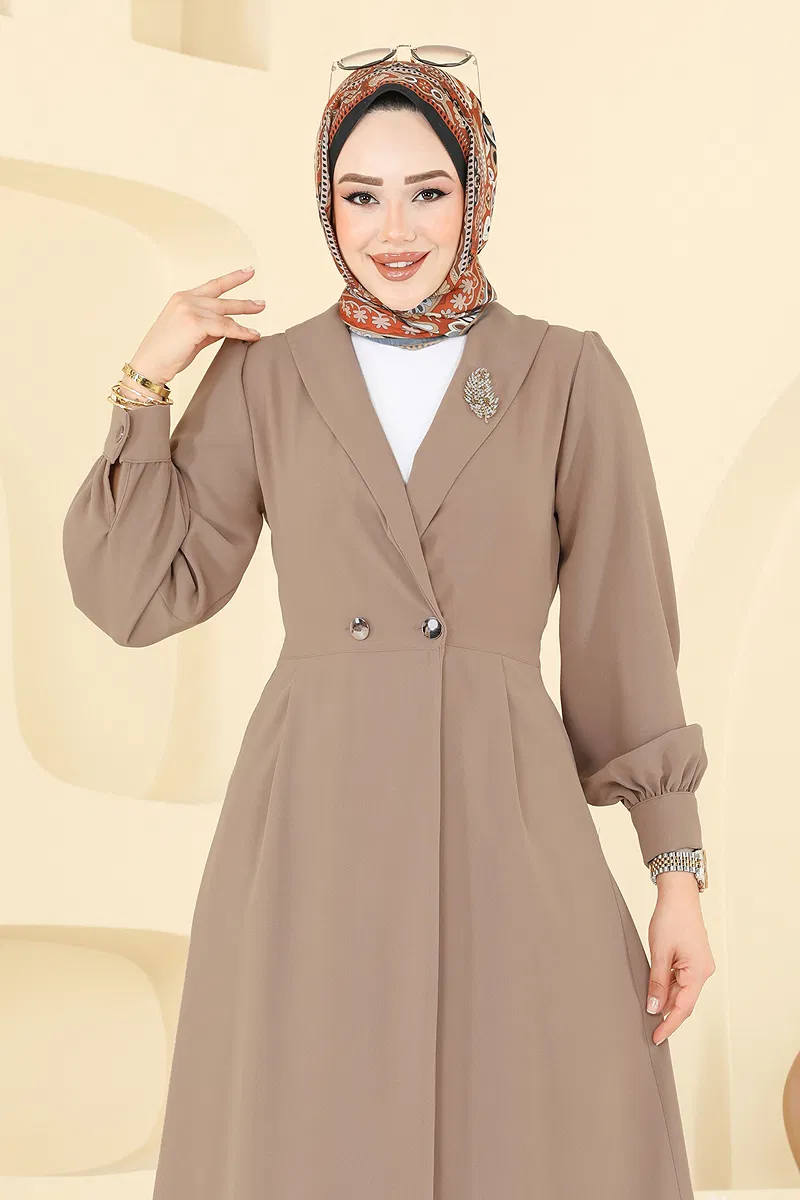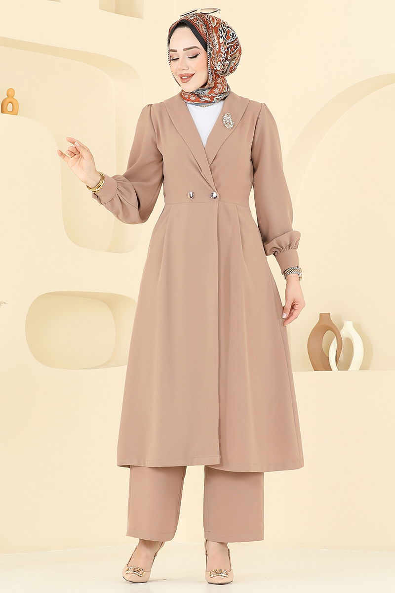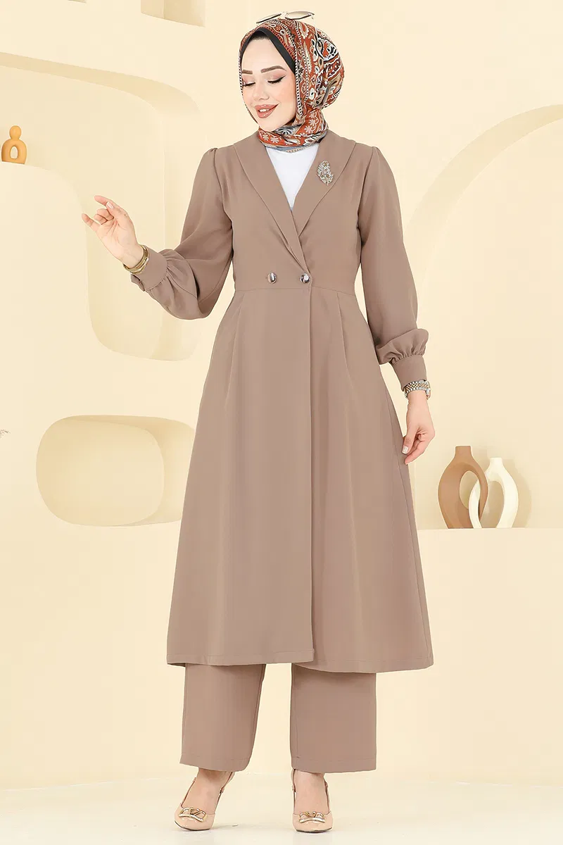 Ürün Özelliği : Yeni sezon tesettür moda ürünüdür. Önden kullanılabilir çift düğmesi bulunmaktadır. Ürün Kruvaze yakadır. Astarsızdır. Ürün beli dikişlidir. Aksesuarlar ürüne dahil değildir. Bluz ürüne dahil değildir. Ürün kullanım amacını göstermek için bluz ile örnek kombin yapılmıştır. Cep mevcuttur. Pantolon beli lastiklidir. Manşet düğmeleri aktiftir.Konsept fotoğraf çekimlerinden dolayı üründe ton farklılığı olabilir.