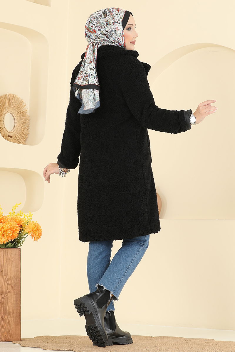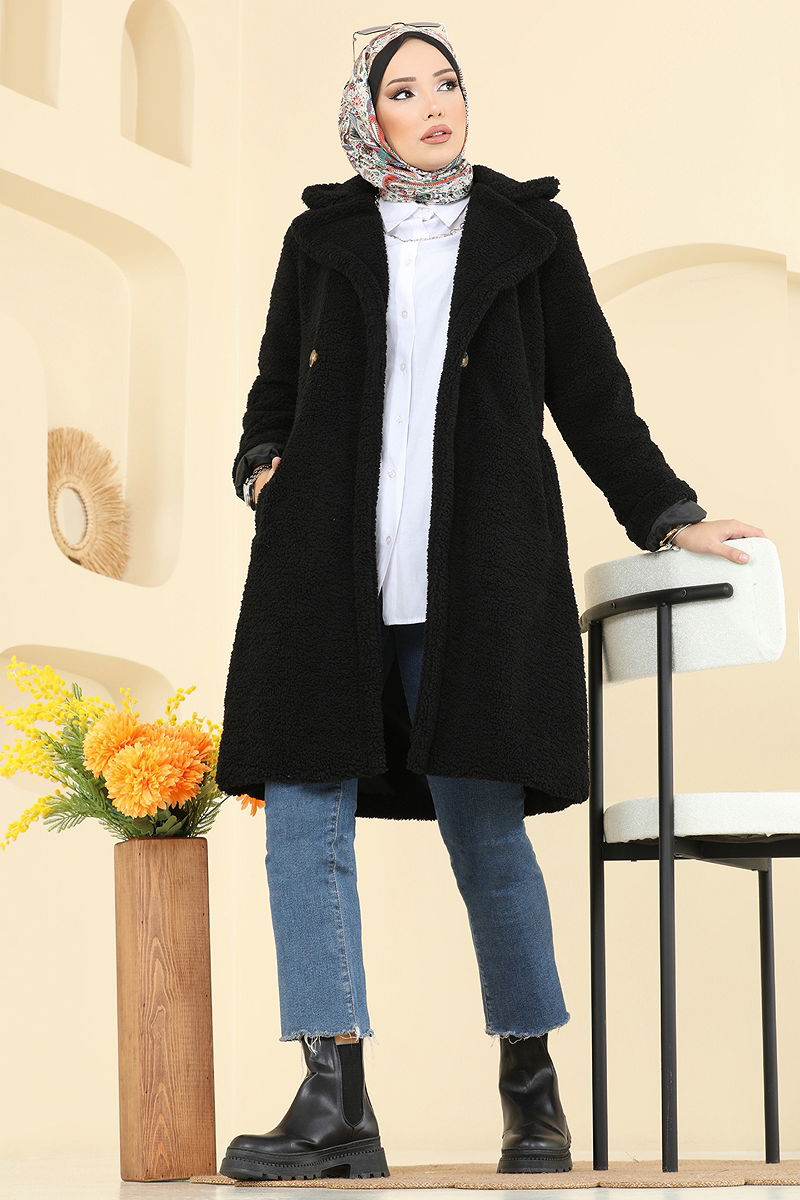 Kruvaze Yaka Peluş Kaban Siyah