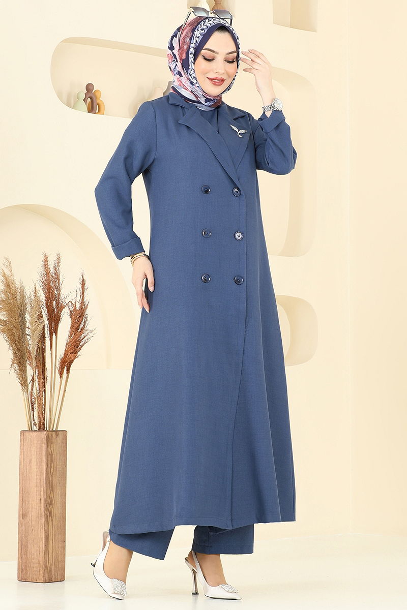 Kruvaze Yaka Üçlü Takım , özenle tasarlanmış bir tesettür giyim ürünüdür. Sofia Keten kumaşı ile dört mevsim rahatlıkla kullanabileceğiniz bu takım, 30 derecede hassas yıkama imkanı sunar. Kruvaze yakası ve ön düğmeli tasarımı ile şıklık ve konforu bir arada sunarken, astarsız yapısı ve esnek beli pantolonu ile gün boyu rahat etmenizi sağlar. İçinde kolsuz bir bluz ve önünden düğmeli bir kap bulunur.İç bluz kafadan giyilmektedir.Bu zamansız parça, gardırobunuzdaki esnek ve şık seçenekler arasında yer alacak.