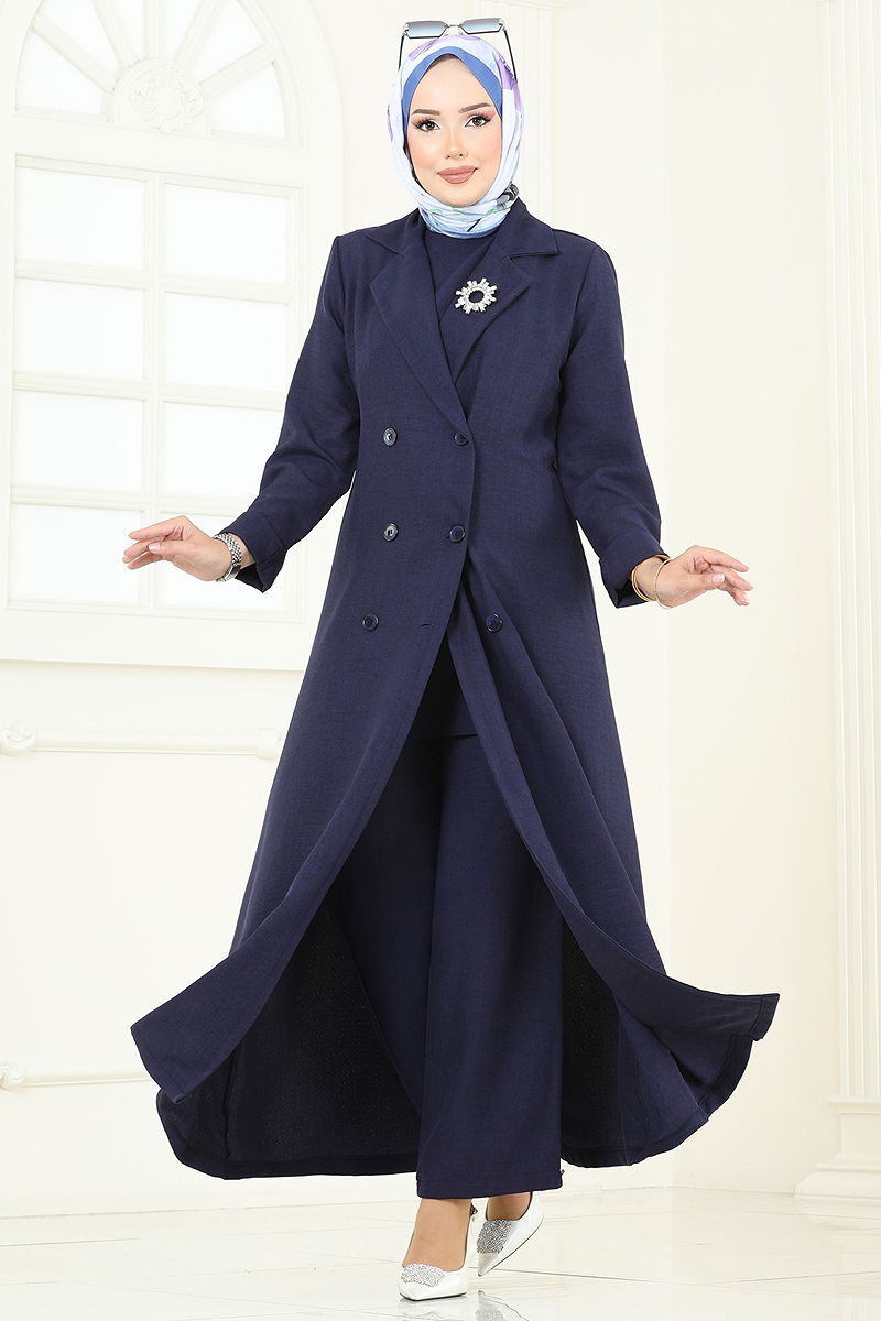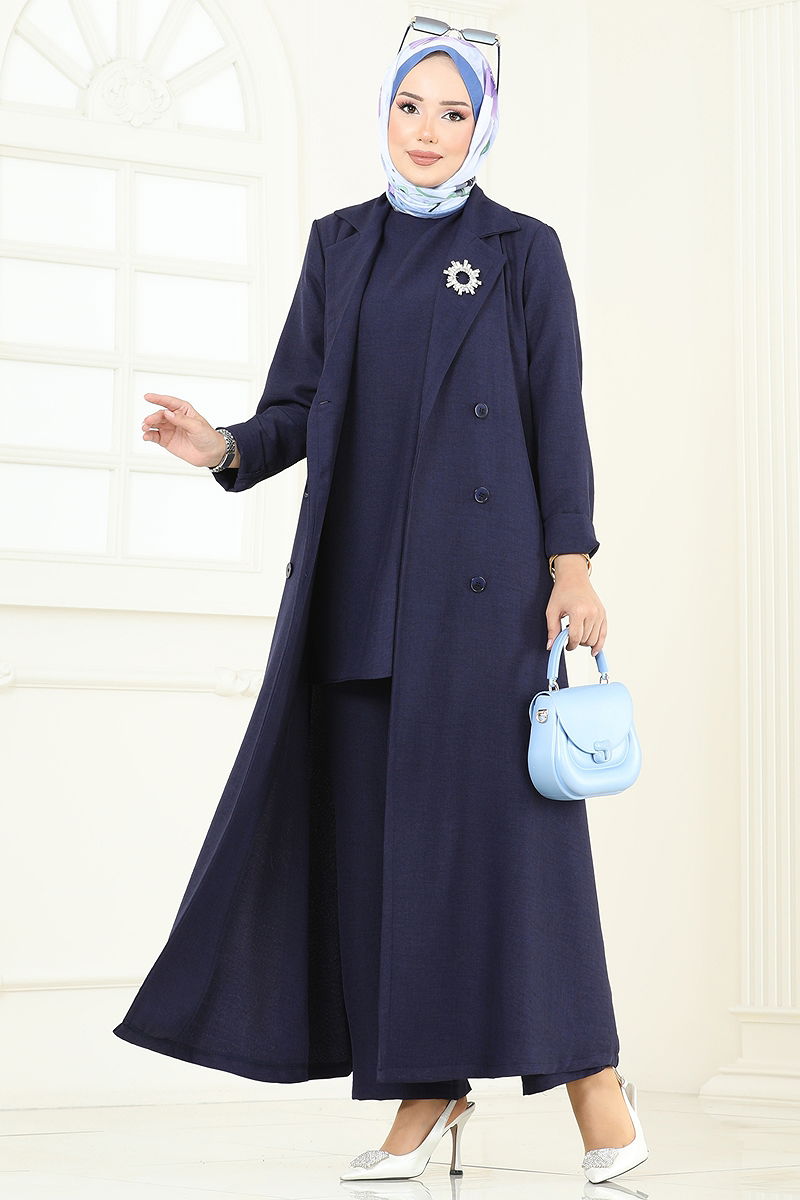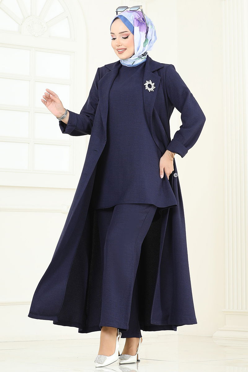 Kruvaze Yaka Üçlü Takım , özenle tasarlanmış bir tesettür giyim ürünüdür. Sofia Keten kumaşı ile dört mevsim rahatlıkla kullanabileceğiniz bu takım, 30 derecede hassas yıkama imkanı sunar. Kruvaze yakası ve ön düğmeli tasarımı ile şıklık ve konforu bir arada sunarken, astarsız yapısı ve esnek beli pantolonu ile gün boyu rahat etmenizi sağlar. İçinde kolsuz bir bluz ve önünden düğmeli bir kap bulunur.İç bluz kafadan giyilmektedir.Bu zamansız parça, gardırobunuzdaki esnek ve şık seçenekler arasında yer alacak.