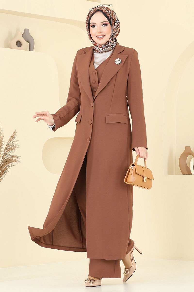 Ürün Özelliği : Yeni sezon tesettür moda ürünüdür. Ürün Kruvaze yakadır. Ürün Önden düğmelidir. Yelek astarlıdır. İç yelek kolsuzdur. Bluz ürüne dahil değildir. Ürün kullanım amacını göstermek için bluz ile örnek kombin yapılmıştır. Aksesuarlar ürüne dahil değildir. Pantolon cep mevcuttur.Ceket cep aksesuardır.Omuz vatkası bulunmaktadır. Pantolon önden fermuarlıdır. Konsept fotoğraf çekimlerinden dolayı üründe ton farklılığı olabilir.