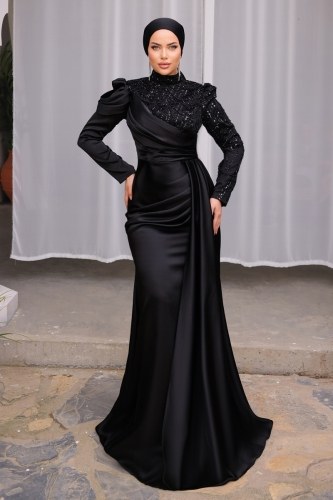 SUAL Pul İşlemeli Saten Abiye 4569D170 Siyah