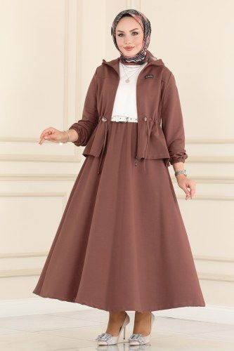 Yakası Bağcıklı Tesettür Elbise 1112BG354 Taba