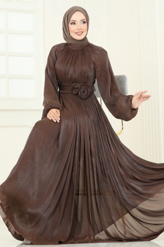 Gül Aksesuarlı Pliseli Abiye 5299D170 Kahve