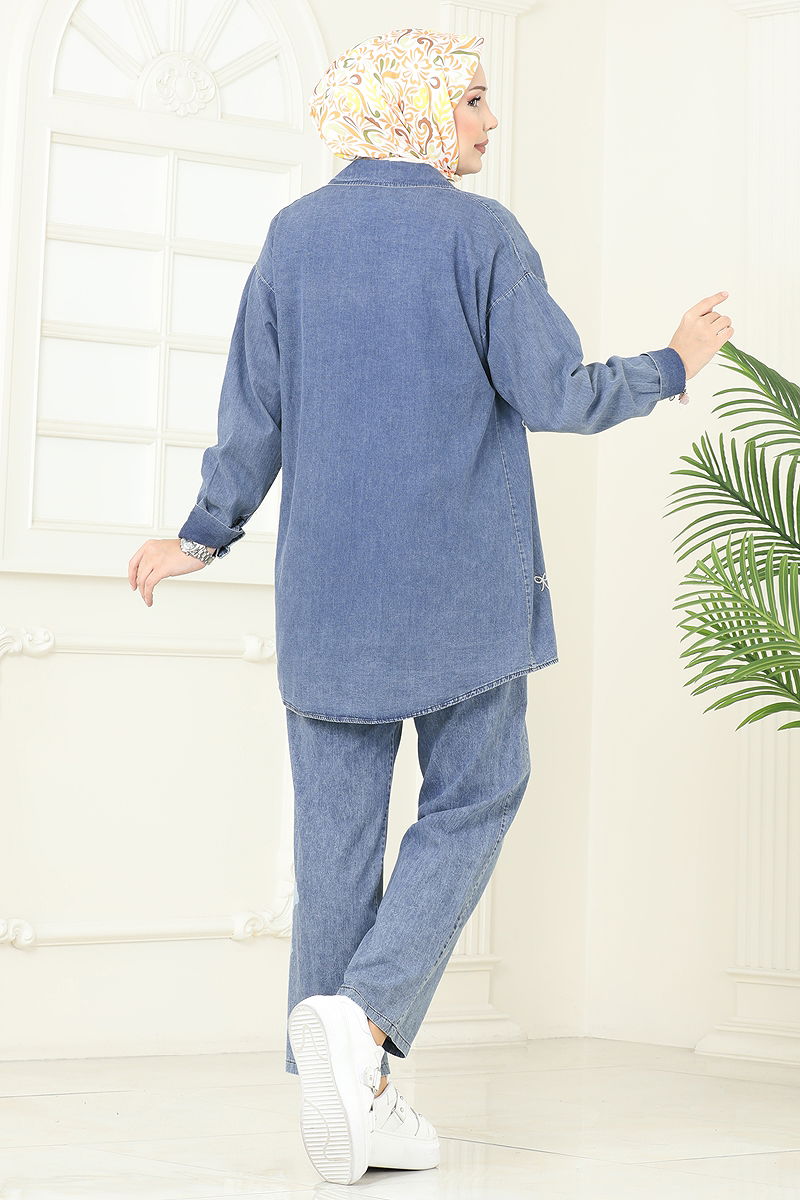 Şık ve modern tasarımı ile dikkat çeken Kurdele Detaylı Kot Takım, tesettür giyimde yeni bir soluk getiriyor. Dört mevsim rahatlıkla kullanabileceğiniz bu kombin, 30 derecede hassas yıkamaya uygun olarak tasarlanmıştır. Gömlek yakalı ve önü düğmeli olan üst parça, herhangi bir astar içermemektedir. Alt parça olarak beli lastikli pantolon, konforlu bir kullanım sunar. Ürün üzerindeki dikilmiş detaylar ve aktif manşet düğmeleri, bu takımı fonksiyonel ve şık yapar. Modelin üzerindeki ürün 38 bedendir ve her bedene uygun alternatifleri mevcuttur.