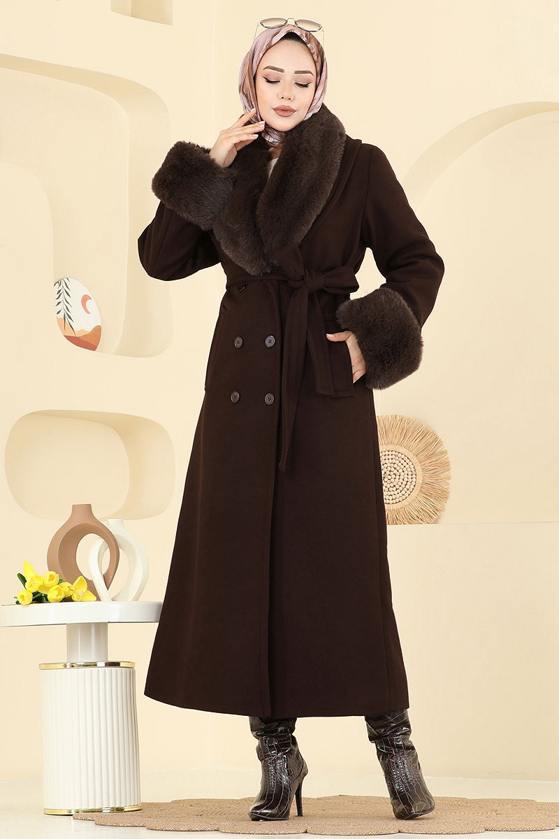 المنتج لديه ياقة مفتوحة. المنتج به أزرار من الأمام. مبطنة. يتضمن المنتج الحزام و الفرو ويمكن استخدامهم حسب الرغبة الحزام متضمن، ،يمكن استخدامها حسب الرغبة الجيب متاح. الاكمام مزينة بالفرو قد يكون هناك اختلاف في الدرجة اللونية في المنتج بسبب التقاط الصور الفوتوغرافية.