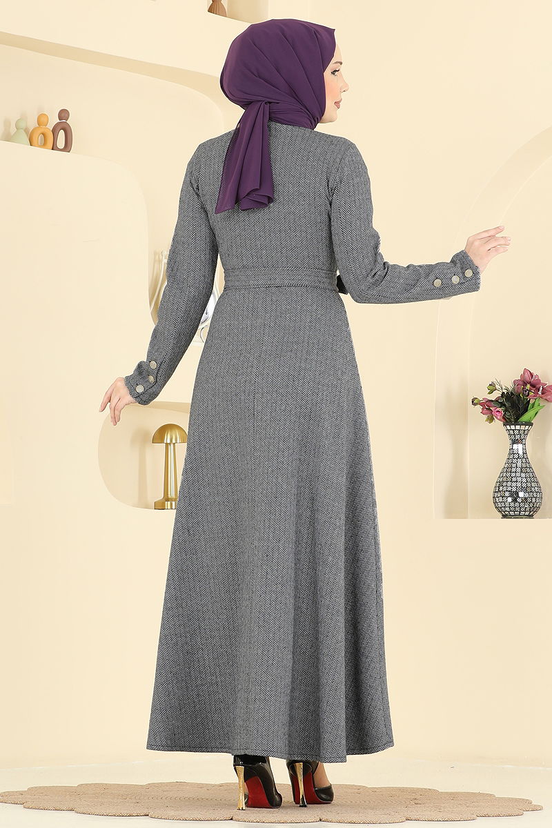 Kuşak detaylı ve gömlek yaka özellikleri ile öne çıkan bu balıksırtı elbise, tesettür giyim tercih edenler için ideal bir seçimdir. Dört mevsim rahatlıkla kullanılabilen bu model, 30 derecede hassas yıkama imkanı sunar. Özel dokusu ve şık tasarımı ile gardırobunuzda vazgeçilmez bir yer edinecek. Elbise önünden yarım düğmeli yapısı ve kuşaklı bel tasarımı ile fonksiyonel bir kullanım sağlar. Manşetlerdeki aktif düğmeler ile de şıklığınızı tamamlayın. Bu elbise, herhangi bir kemer köprüsüne ihtiyaç duymadan zarafetinizi ön plana çıkarır.