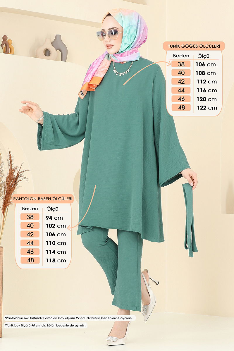 Ürün Özelliği : Yeni sezon tesettür moda ürünüdür. Ürün Bisiklet yakadır. Astarsızdır. Kemer ürüne dahildir, isteğe bağlı kullanılmayabilir. Aksesuarlar ürüne dahil değildir. Pantolon beli lastiklidir. Konsept fotoğraf çekimlerinden dolayı üründe ton farklılığı olabilir.