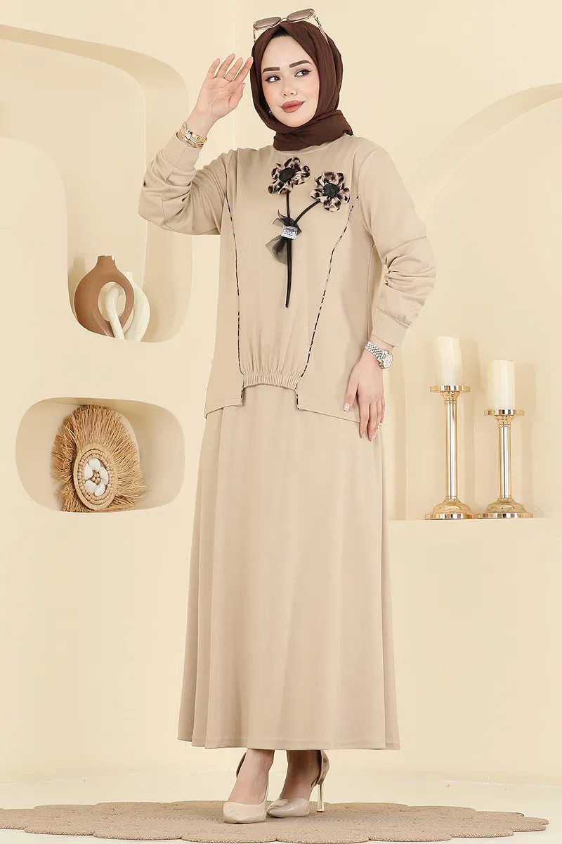 Ürün Özelliği : Yeni sezon tesettür moda ürünüdür. Ürün 2 parçadan oluşmaktadır. Ürün kafadan giyilmektedir. Ürün Bisiklet yakadır. Yırtmaç aktif değildir.. Astarsızdır. aksesuar detayları ürüne dikilidir. Arma detayı dikilidir. Günlük kullanıma uygundur. Etek beli lastiklidir. Konsept fotoğraf çekimlerinden dolayı üründe ton farklılığı olabilir.