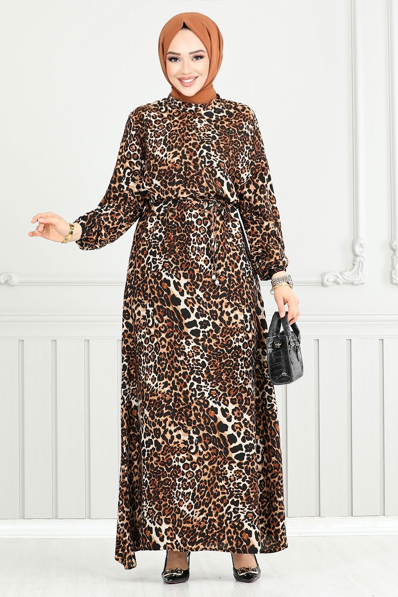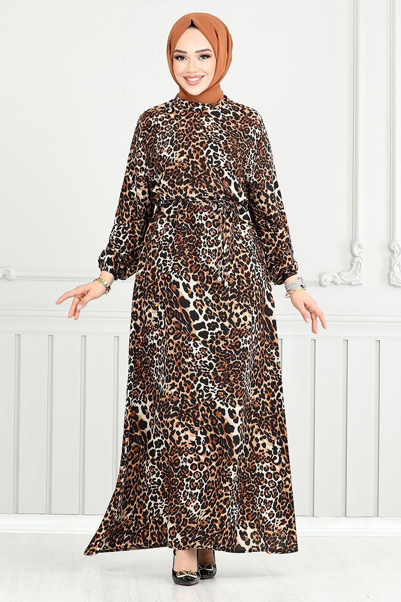 Leopar Desen Viskon Elbise, dört mevsim rahatlıkla kullanabileceğiniz stil sahibi bir tesettür üründür. Viskon kumaştan üretilmiş olan bu elbise, elde yıkama gerektiren özenli bir kullanım sunar. Yarım hakim yakası ve astarsız yapısı ile konforu ön planda tutar. Sırt kısmında bulunan fermuar, giyimi kolaylaştırır. Model üzerinde 38 beden görülmekte ve manşetleri lastiklidir. Elbisenin tasarımında yer alan kemer, iki ucu dikilmiş olup, orta kısım dikişsiz bırakılarak dalgalanmayı önler. Kemer, elbise ile birlikte gelmekle birlikte, isteğe bağlı olarak çıkarılabilir.