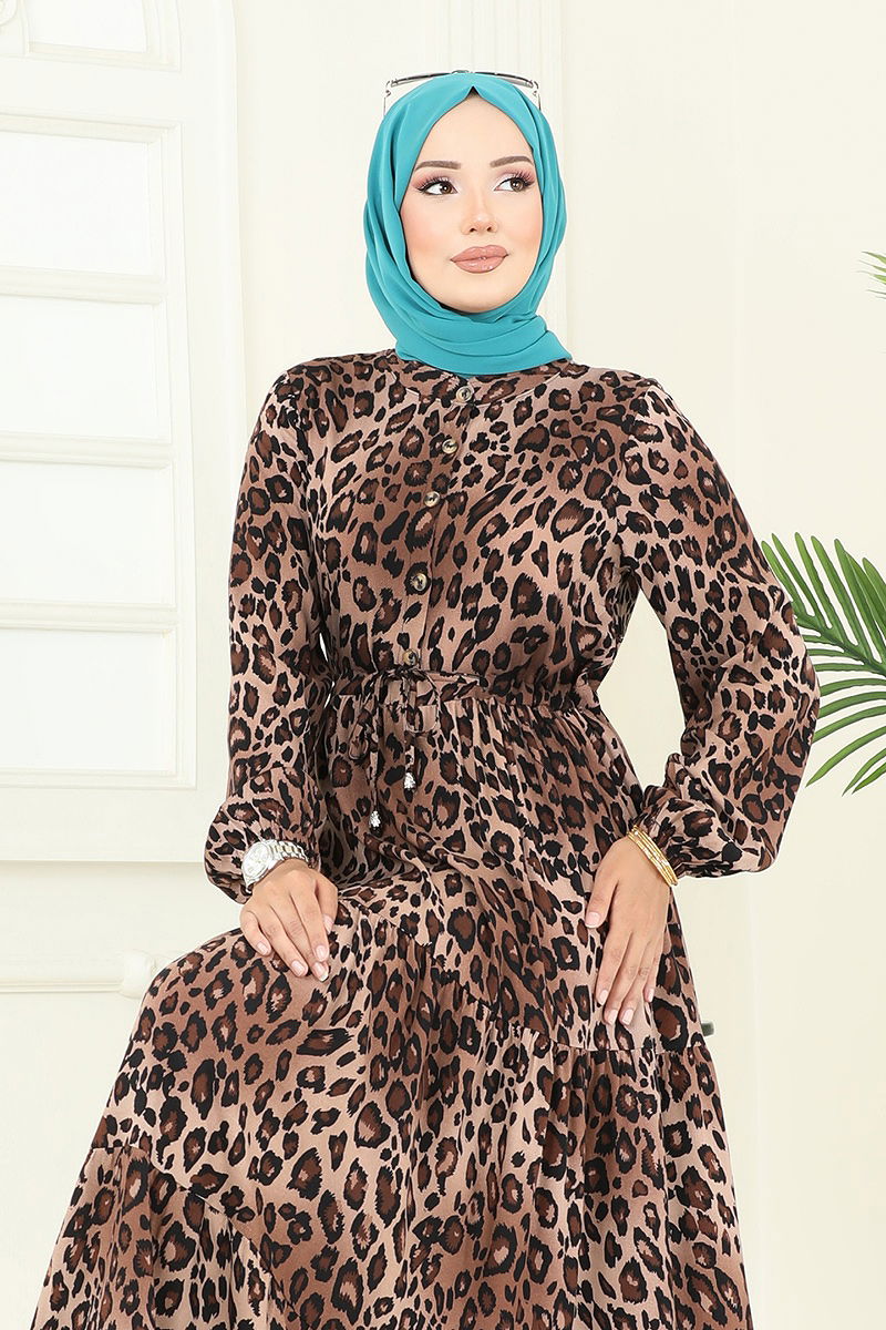 Leopar Desenli Viskon Elbise Kahve