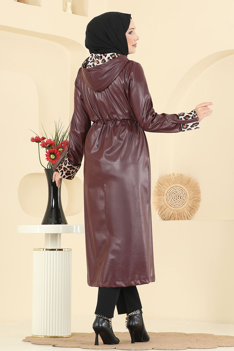Leopar Detay Deri Kap, özellikle sonbahar ve kış aylarında tercih edebileceğiniz şık bir tesettür kaptır. Hassas 30 derece sıcaklıkta yıkanabilen bu ürün, suni deri kumaştan üretilmiştir. Kapşonlu ve astarsız tasarımıyla modern bir görünüm sunar. Ürünün ön kısmındaki fermuar, kullanım kolaylığı sağlar. Beli bağcıklı ve kol manşetlerinde katlama detayı bulunur. Pratik kullanım için kapşona eklenmiş ve cep detayı da düşünülmüştür.