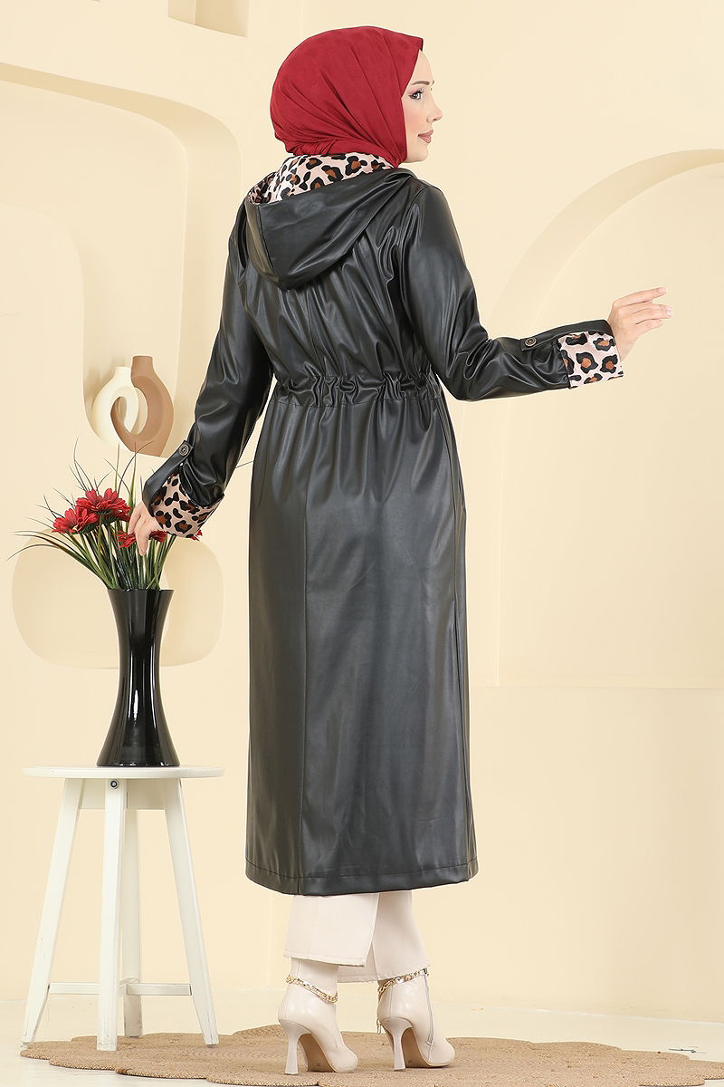 Leopar Detay Deri Kap, özellikle sonbahar ve kış aylarında tercih edebileceğiniz şık bir tesettür kaptır. Hassas 30 derece sıcaklıkta yıkanabilen bu ürün, suni deri kumaştan üretilmiştir. Kapşonlu ve astarsız tasarımıyla modern bir görünüm sunar. Ürünün ön kısmındaki fermuar, kullanım kolaylığı sağlar. Beli bağcıklı ve kol manşetlerinde katlama detayı bulunur. Pratik kullanım için kapşona eklenmiş ve cep detayı da düşünülmüştür.
