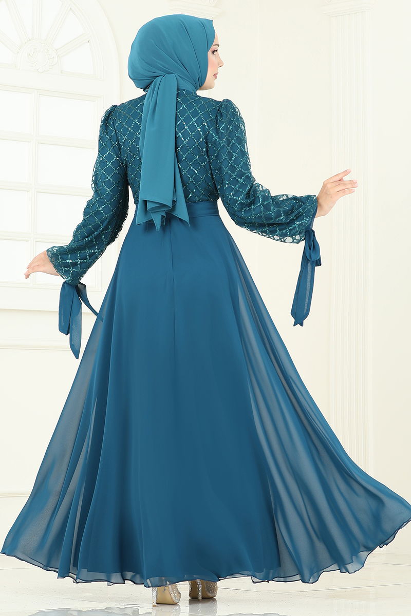 Manşeti Bağcık Detaylı Şifon Abiye 5704EDF311 Petrol