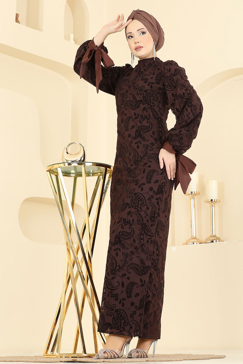 Manşeti Bağcıklı Baskılı Elbise 5753EDF311 Kahve