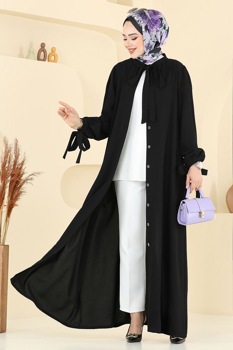 Manşeti Bağcıklı Elbise Ferace Siyah