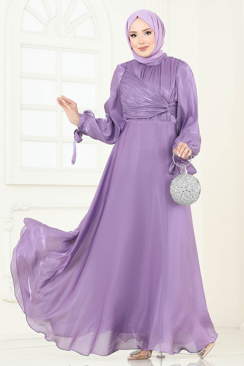 Manşeti Bağcıklı Organze Abiye Lila