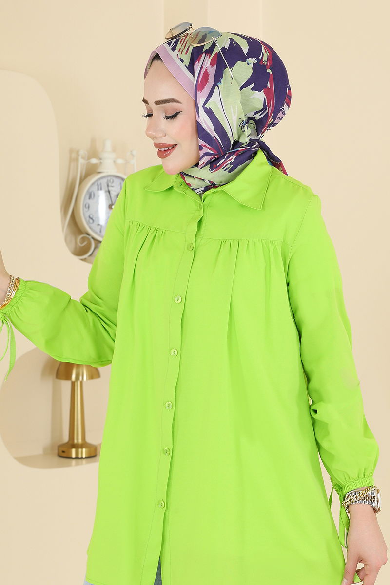 Manşeti Bağcıklı Terikoton Gömlek 337ASN888 Fıstık Yeşili