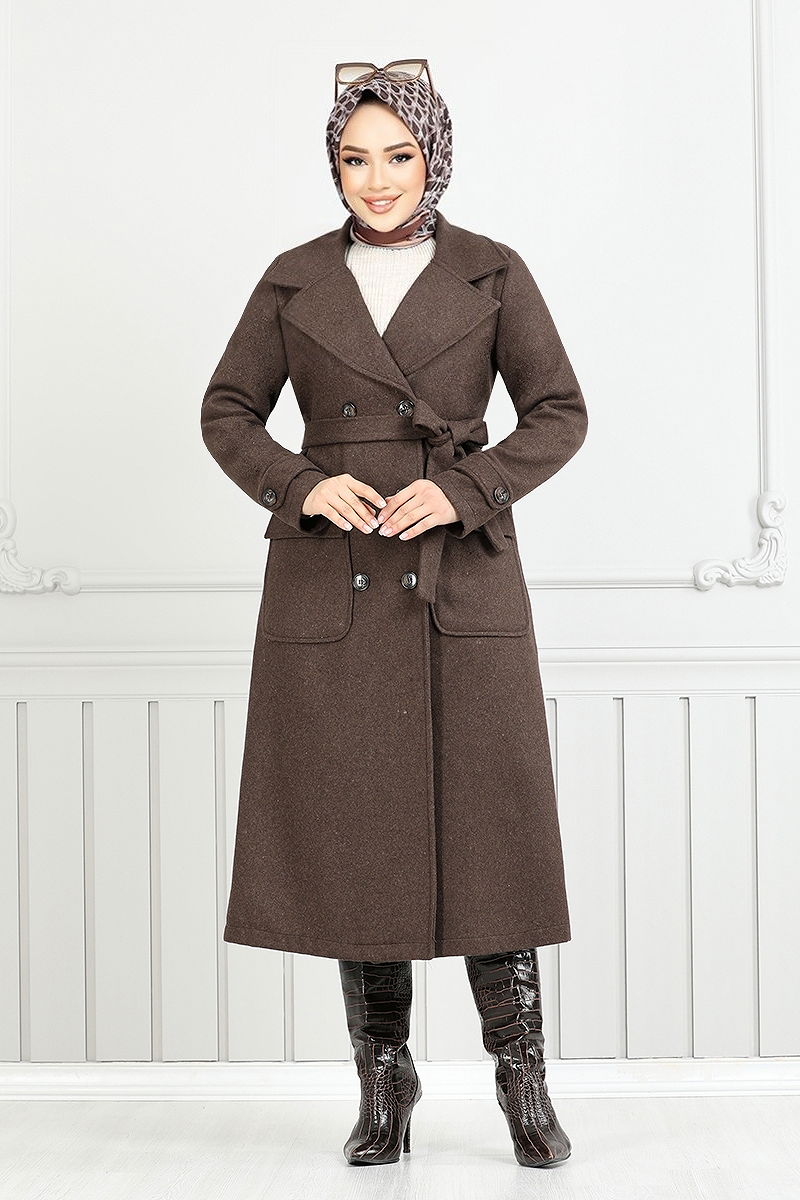 Cuffed Buttoned Cashmere Coat is a Trenchcoat model for hijabi clothing. It can be used in Autumn and Winter seasons. It can be WASHED WITHOUT SQUEEZING AT 30 DEGREES. (DELICATE WASH) It is made of cashmere fabric. The product has a Cross lapel collar. The product is buttoned from the front. It is without lining. (The product on the model is size 38.) The two ends of the belt have been sewn to prevent it from fluttering, and the middle part is left empty (seamless). The belt is included in the product and may be optionally used. It has a Pocket. Cuff buttons are accessories.