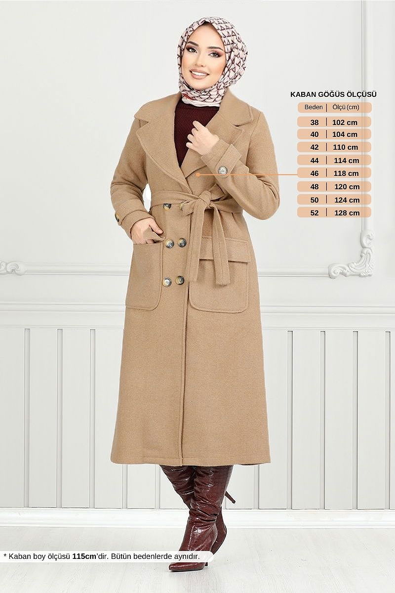Manşeti Düğmeli Kaşe Kaban model tesettür ürünüdür. Sonbahar ve Kış sezonunda kullanılabilir. 30 DERECEDE SIKTIRILMADAN YIKANABİLİR. (HASSAS YIKAMA) Kaşe kumaştan imal edilmiştir. Ürün Kruvaze yakadır. Ürün Önden düğmelidir. Astarsızdır. (Modelin üzerindeki ürün 38 bedendir.) Kemerin dalgalanmaması için iki ucu dikilmiş, orta kısım boş (dikişsiz) bırakılmıştır. Kemer ürüne dahildir, isteğe bağlı kullanılmayabilir. Cep mevcuttur. Manşet düğmeleri aksesuardır.