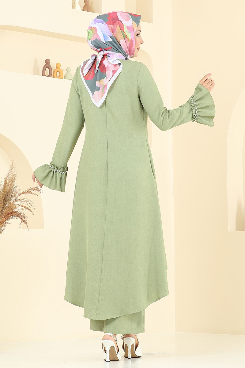 Manşeti fırfırlı Sofia Takım , tesettür giyim için ideal bir seçenektir. Dört mevsim rahatlıkla kullanılabilecek bu ürün, 30 derecede hassas yıkama ile temizlenebilir. Sofia keten kumaştan üretilmiş olup, bisiklet yakaya ve astarsız tasarıma sahiptir. Sırttan fermuarlı yapıda olan tunik, boncuk ve taş detayları ile şıklığı tamamlıyor. Pantolon beli lastikli olduğu için konfor sunar. Bu şık ve pratik takım, gardıropunuzun vazgeçilmez bir parçası olacak.