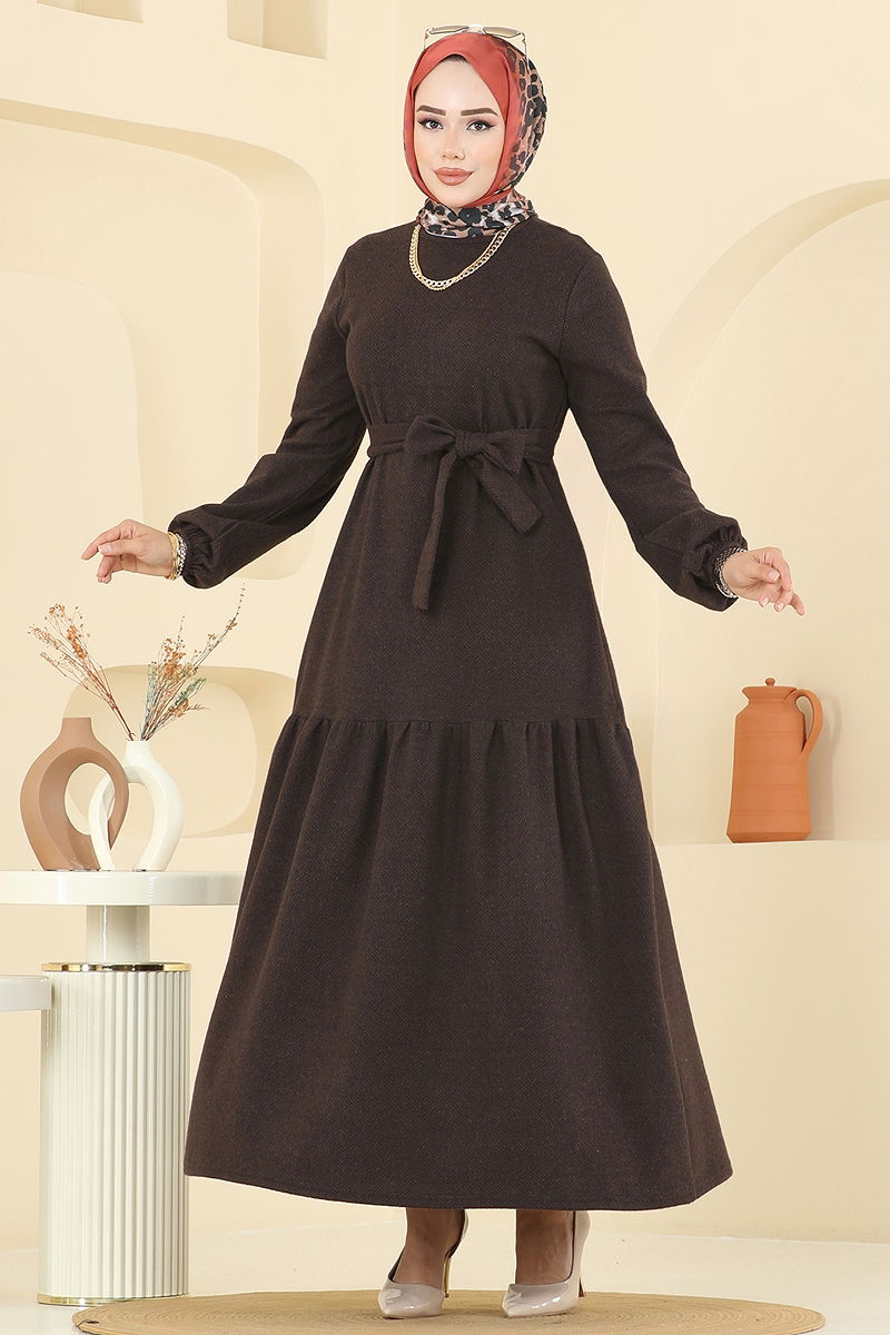 Manşeti Lastikli Balıksırtı Elbise Kahve
