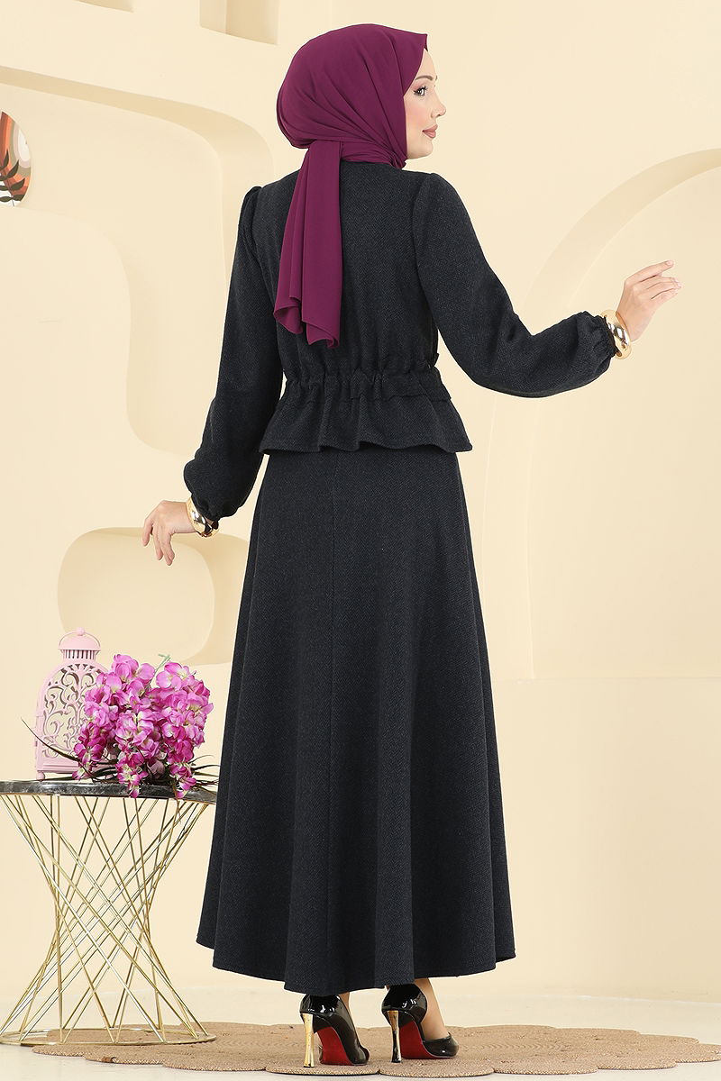 Sonbahar ve Kış ayları için mükemmel olan bu Manşetli Lastikli Balıksırtı Takım, tesettürlü hanımlar için ideal bir seçimdir. 30 derecede hassas yıkama önerisiyle uzun süre formunu koruyacak şekilde tasarlanmıştır. Bisiklet yaka ve astarsız tasarımıyla modern bir duruş sergileyen bu kıyafet, beli bağcıklı etek ve fermuarlı etek beli ile konforu ve şıklığı bir arada sunar.