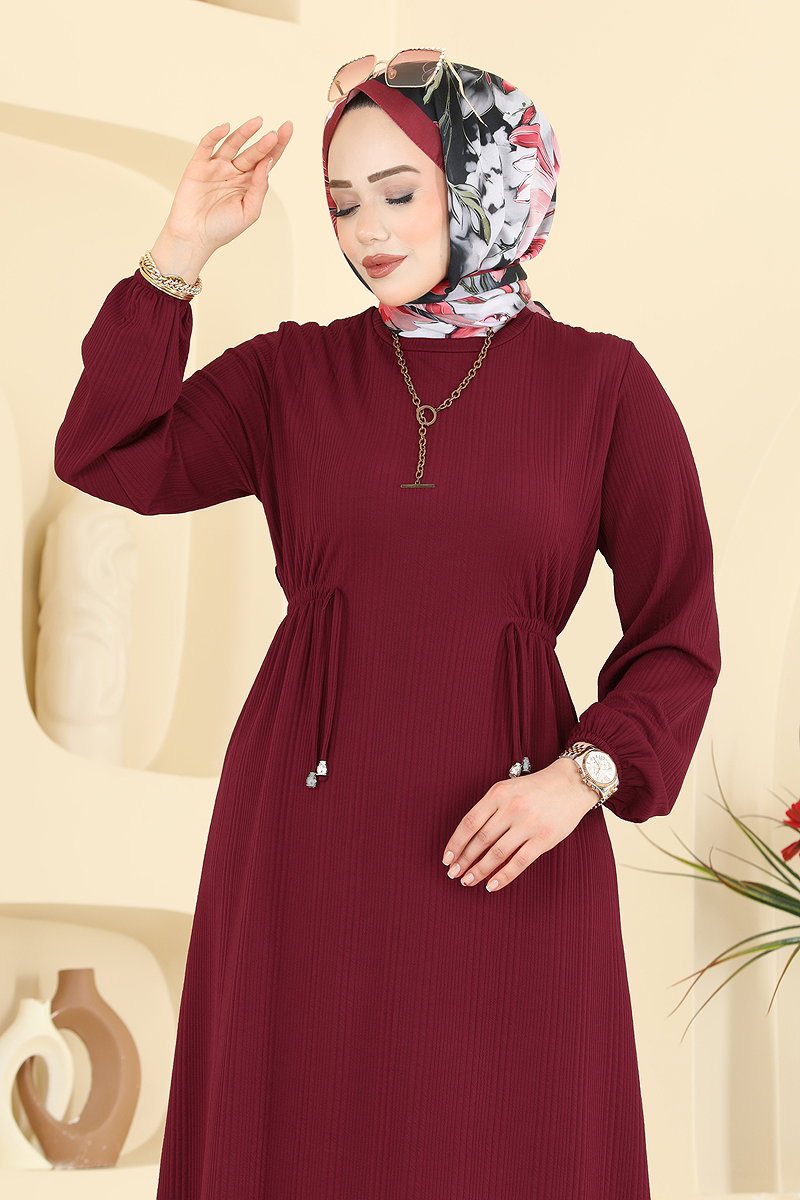 Manşeti Lastikli Beli Büzgülü Elbise 8018UZ662 Bordo