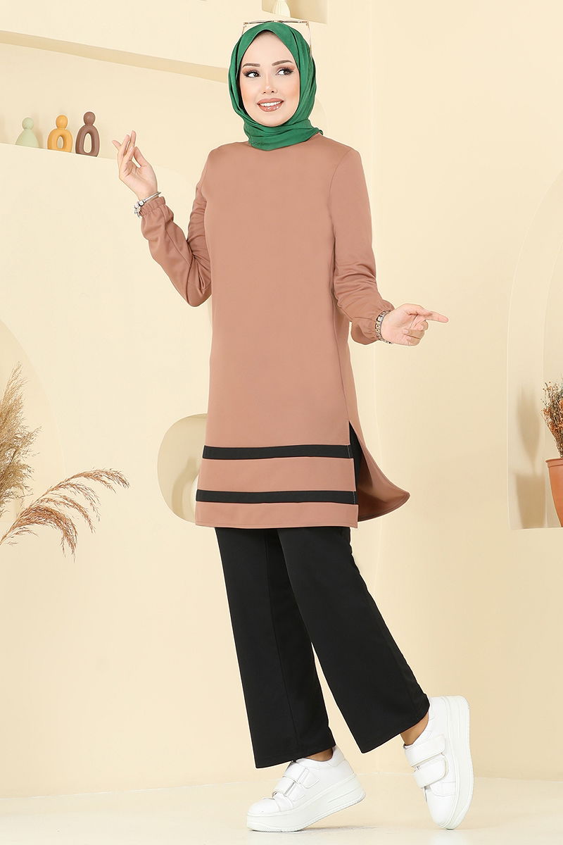 Ürün Özelliği : Yeni sezon tesettür moda ürünüdür. Ürün Bisiklet yakadır. Tunik yandan yırtmaçlıdır.. Astarsızdır. Pantolon beli lastiklidir. Manşet lastiklidir. Konsept fotoğraf çekimlerinden dolayı üründe ton farklılığı olabilir.