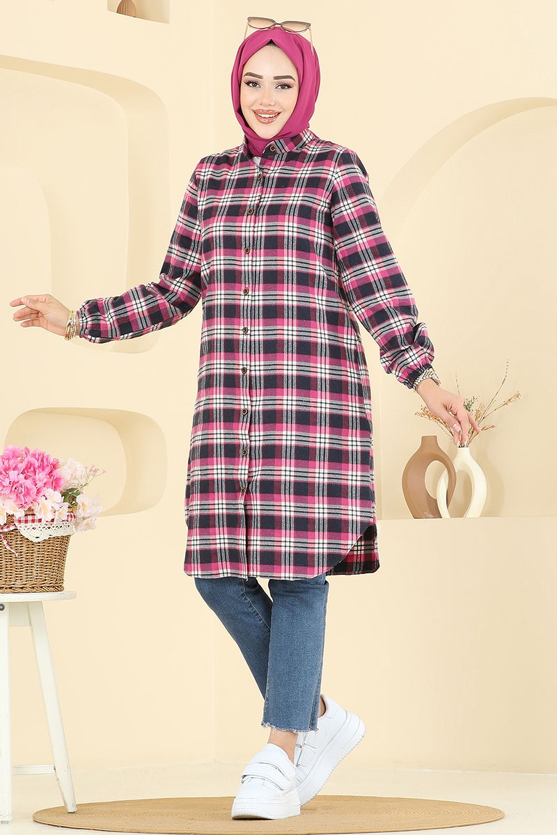 Manşeti Lastikli Ekose Tunik Fuşya