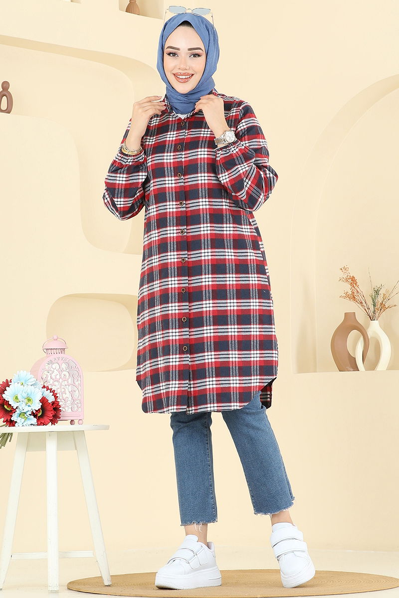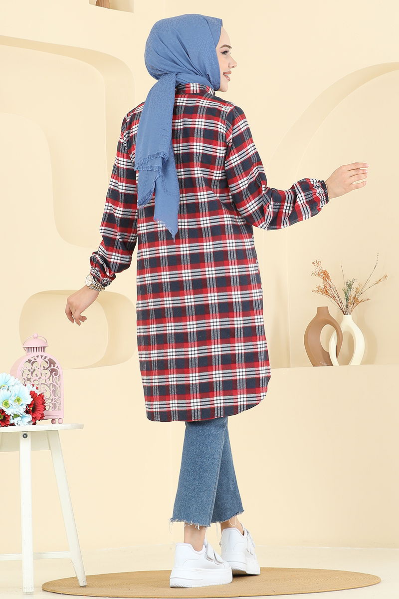 Manşeti Lastikli Ekose Tunik Kırmızı