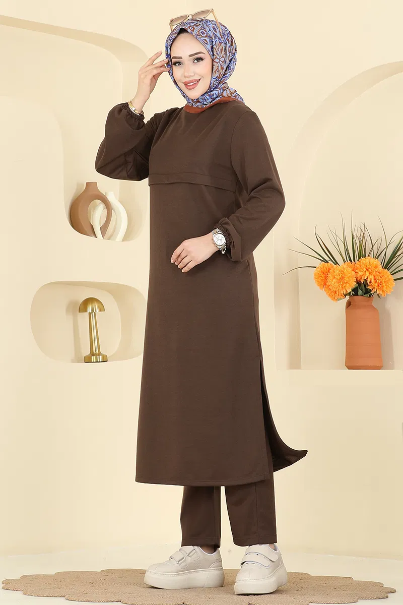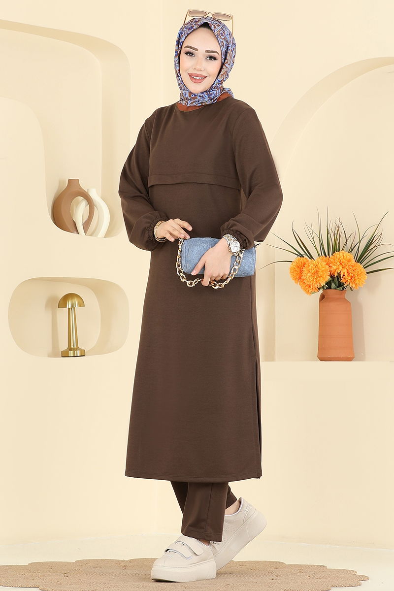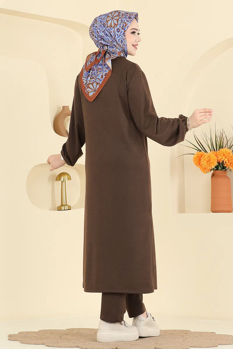 Manşeti Lastikli İki İplik Takım , tesettür için özel olarak tasarlanmıştır ve dört mevsim boyunca rahatlıkla kullanılabilir. Hassas giysiler için önerilen 30 derecede yıkama imkanı sunar. Ürün, bisiklet yakasıyla modern bir görünüm kazanırken, yanlardaki yırtmaçlar tuniğe dinamik bir hava katmaktadır. Astarsız olan bu takım, rahat bir kullanım sunar. Pantolonun beli lastikli olup, tunik ve pantolon manşetleri son derece kullanışlıdır. Modelin giydiği ürün 38 bedendir.