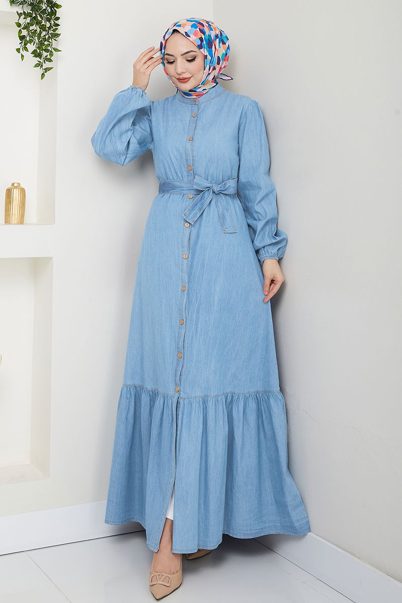 Manşeti Lastikli Kot Elbise Açık Kot
