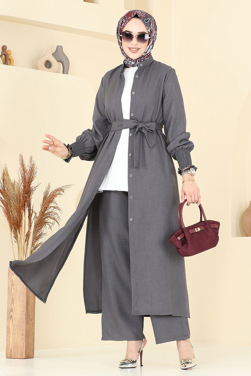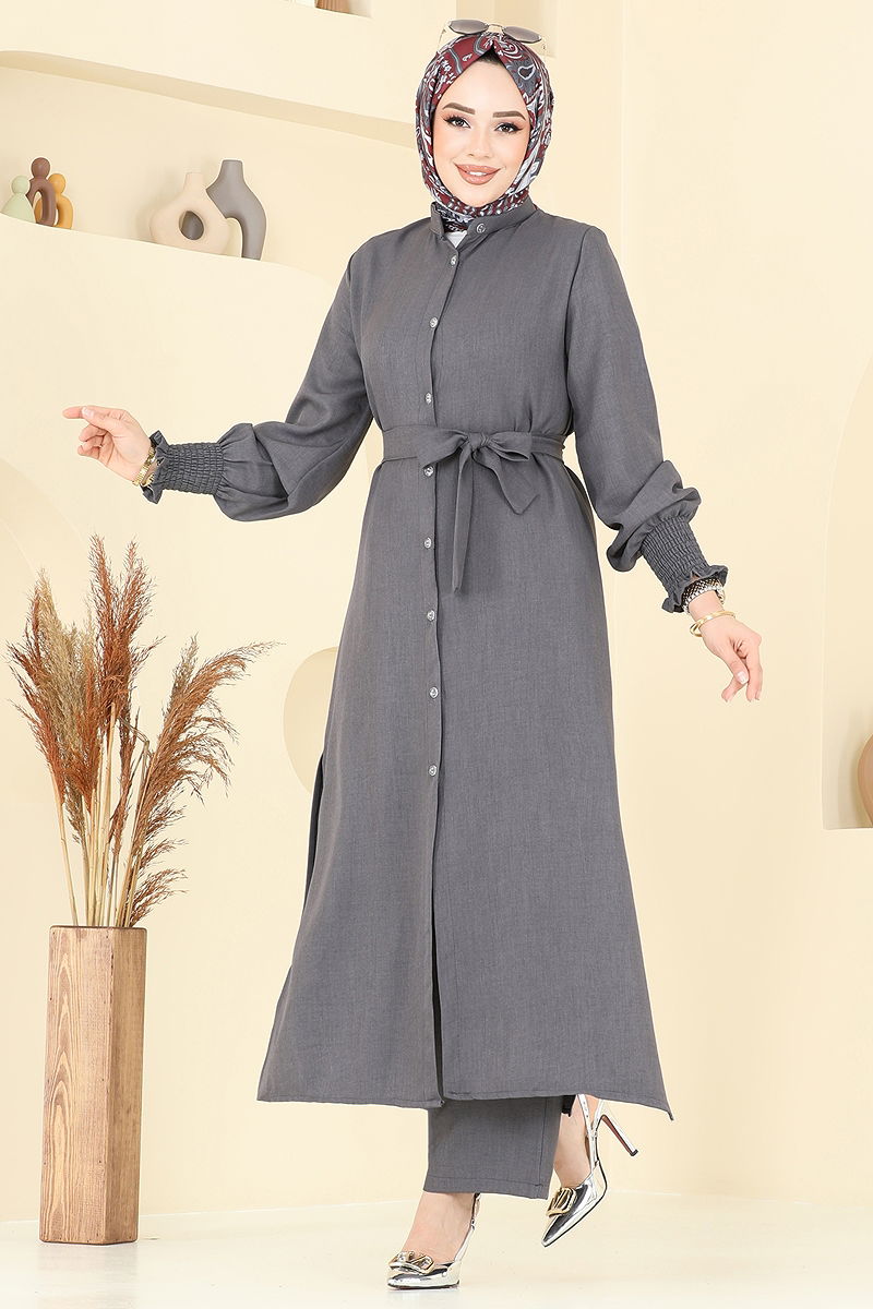 Manşeti lastikli ve sofia keten kumaştan imal edilen bu şık takım, dört mevsim rahatlıkla kullanılabilir. Tunik ön düğmeli, yandan yırtmaçlı ve astarsızdır, pantolonun beli ise rahat kullanımınız için lastiklidir. İçerisinde yer alan kemer, iki ucu dikilmiş ve ortası dikişsiz olup, isteğe bağlı kullanıma uygun tasarlanmıştır. Hassas yıkama ile 30 derecede yıkanabilir. Tesettür modasını rahatlık ve şıklık ile birleştiren bu kombin, her ortamda göz kamaştırmanız için ideal.
