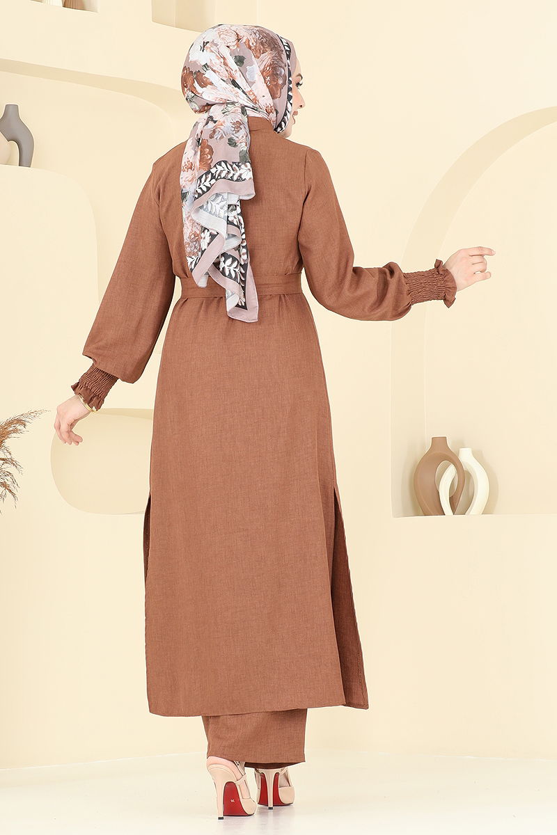 Manşeti lastikli ve sofia keten kumaştan imal edilen bu şık takım, dört mevsim rahatlıkla kullanılabilir. Tunik ön düğmeli, yandan yırtmaçlı ve astarsızdır, pantolonun beli ise rahat kullanımınız için lastiklidir. İçerisinde yer alan kemer, iki ucu dikilmiş ve ortası dikişsiz olup, isteğe bağlı kullanıma uygun tasarlanmıştır. Hassas yıkama ile 30 derecede yıkanabilir. Tesettür modasını rahatlık ve şıklık ile birleştiren bu kombin, her ortamda göz kamaştırmanız için ideal.
