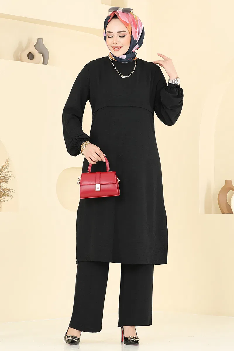 Manşeti Lastikli Tesettür Takım, dört mevsim rahatlıkla kullanabileceğiniz fonksiyonel bir tesettür giyim ürünü. Aerobin kumaştan üretilen bu takım, hassas yıkama ile 30 derecede yıkanabilir. Bisiklet yakalı tunik yan yırtmaçlara sahipken, pantolon beli lastiklidir, ikisi birlikte mükemmel bir uyum sergiler. Ürün 38 beden ölçülerinde olup astarsızdır ve arka bölümde kullanışlı bir düğmeye sahiptir. Aksesuarlar dahil değildir.