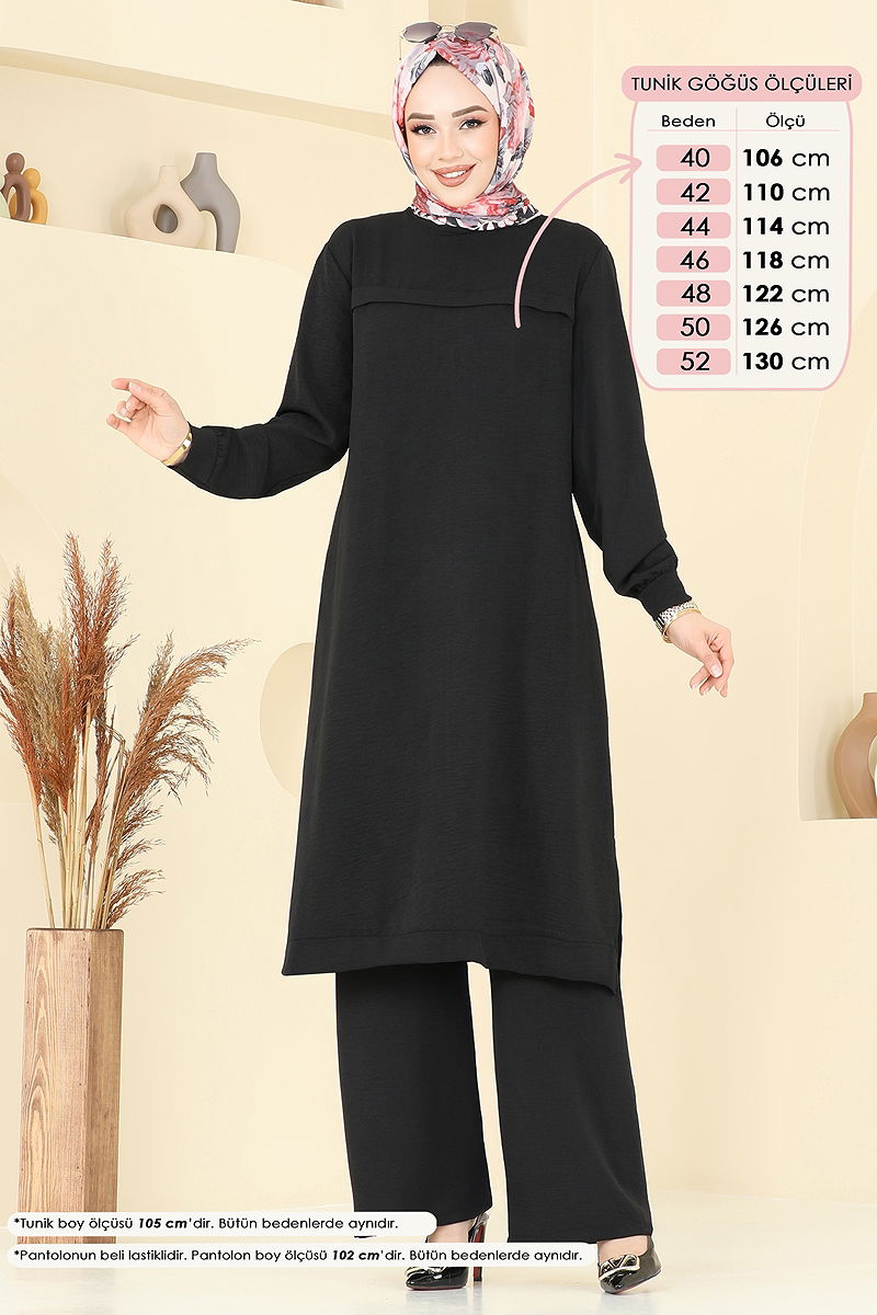 Ürün Özelliği : Yeni sezon tesettür moda ürünüdür. Sırttan kullanılabilir bir düğmesi bulunmaktadır. Ürün Bisiklet yakadır. Tunik yandan yırtmaçlıdır.. Astarsızdır. Pantolon beli lastiklidir. Konsept fotoğraf çekimlerinden dolayı üründe ton farklılığı olabilir.