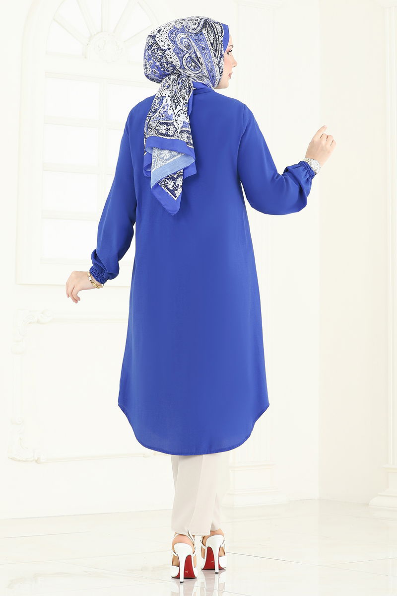 The Elastic Cuffed Tunic is an ideal choice for modest fashion. Suitable for all seasons, it can be washed at 30 degrees on a gentle cycle, making it practical and easy to care for. Made from poplin fabric, this stylish tunic features a shirt collar and hidden buttons, offering a modern look. Its unlined design ensures it is light and comfortable, while its elastic cuffs facilitate easy wear. The product shown on the model is a size 38. Perfect for a stylish and comfortable appearance.
