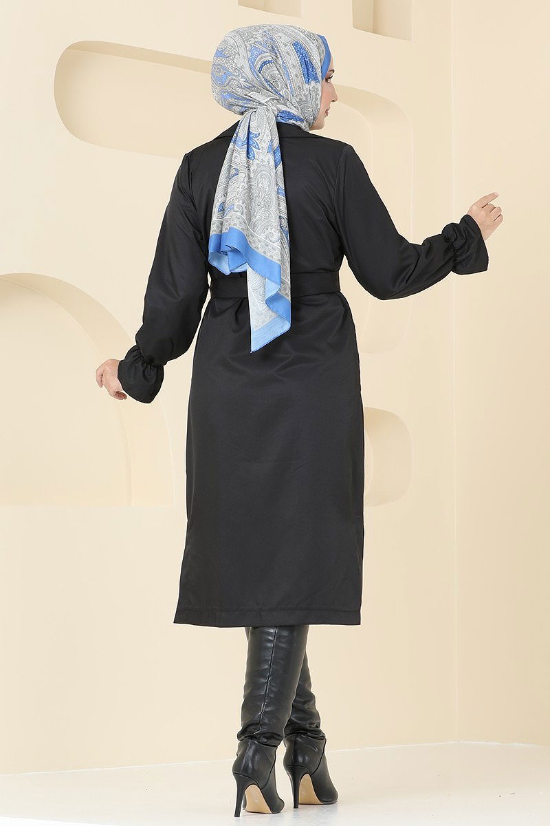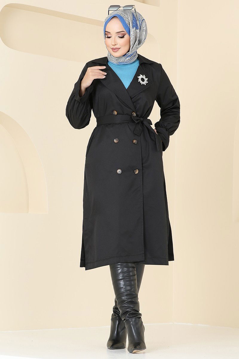 Manşeti Lastikli Trençkot Siyah